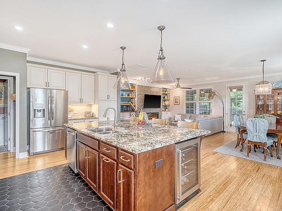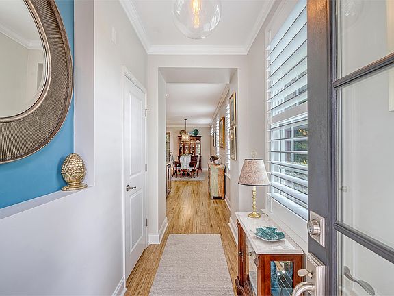 Welcome to this stunning end-unit townhome in the desirable Dunes West community, located just outside the gated area. This home offers a perfect blend of privacy and convenience, backing to serene woods and situated next to a wide open space with more across the street. The location is unbeatable, with a short walk to groceries, restaurants, and shops.Step inside to an open-concept living space, flooded with natural light from the many windows adorned with wide-slat plantation shutters. The entertainment area is a showstopper, featuring floating shelves, custom cabinetry, a Dimplex electric fireplace, and a beautiful tiled backdrop, perfect for your TV setup. The kitchen is a chef's dream, boasting a huge granite island, new tile flooring and backsplash, and modern finishthroughout. Additional highlights include custom wrought iron stair railings, bamboo hardwood floors throughout, a loft with decorative moldings, and new paint with bright LED lighting in every room. The half bath features a stylish patterned tile floor. Enjoy the outdoors in your large screened-in porch overlooking a low-maintenance, fenced backyard with pavers and artificial turf, ideal for relaxing or entertaining. The two-car garage offers ample storage and is equipped with a utility sink. Energy-efficient features like a Rinnai tankless water heater, Halo water filtration system, and surge protectors on the HVAC and power panel add extra peace of mind. This home truly offers it all location, style, and convenience!
