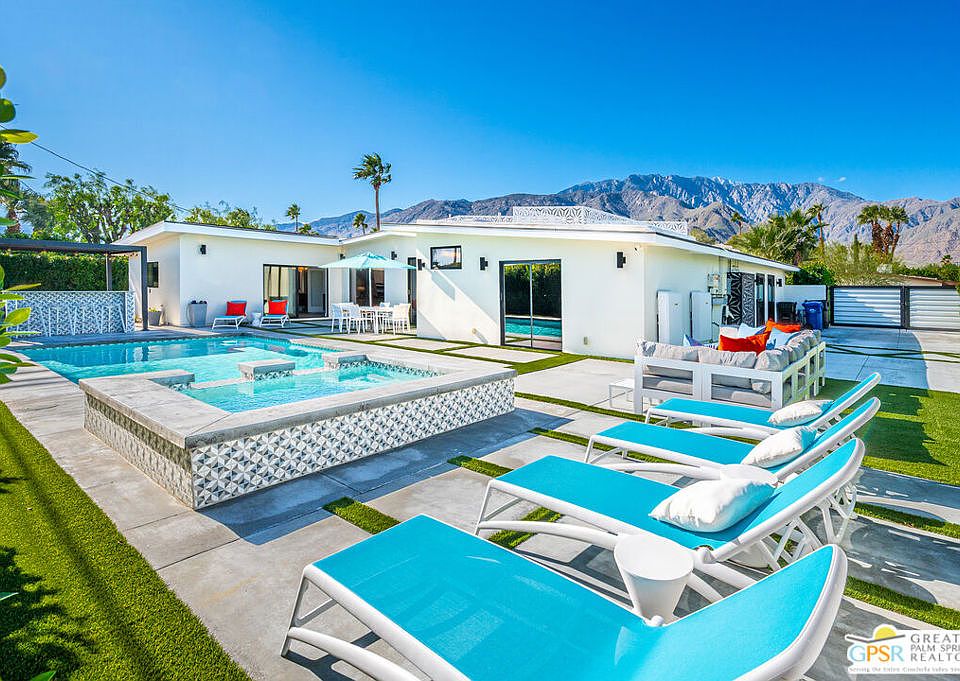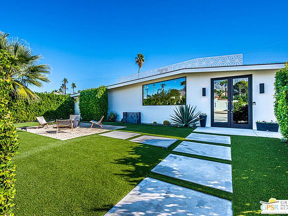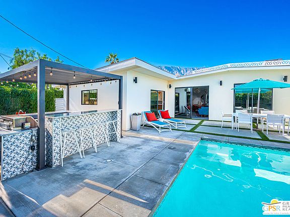 Wait! Stop searching you've found it. Mid-Century? Check! Stunningly re-imagined? Check! Pool? Check! Spa? Check! 4 Bedrooms + 3 Bathrooms? Check! That's right this one checks every box and is ready for you to move in NOW. Built in 1959 by iconic architects Palmer & Krisel, this Alexander Mid-Century Modern has 4 bedrooms, 3 bathrooms, and 2,465 sq ft. located in Racquet Club Estates. Extensively updated while preserving the magic of modernist desert living, the home features classic post-and-beam ceilings, an inviting open floor plan, and design-forward upgrades throughout. The chef's kitchen showcases walnut cabinetry, a large island, porcelain flooring, and San Jacinto mountain views. Living and dining spaces with walls of glass and sliding doors open to the outdoors creating amazing flow. Recent interior design enhancements include a dramatic custom walnut feature wall in the main living area, with bar cabinetry refaced to perfectly match both book-matched and butt-matched for a cohesive, high-end look. A cabinet-depth Bespoke Gallery refrigerator seamlessly blends into the kitchen cabinetry. The entire interior was freshly painted, while the primary suite now features a custom walnut bed wall, plus a newly added walk-in closet offering exceptional storage. The outdoor living experience was completely reimagined in 2024 and is nothing short of resort-caliber. The private backyard features new concrete and AstroTurf, extensive Ficus landscaping along the perimeter, and a freshly acid-washed pool and elevated spa with waterfall. A fully functional outdoor kitchen with plumbing, new countertops, and a louvered pergola anchors the space, complemented by a fire pit connected to natural gas .The front yard was also upgraded in 2024, featuring a new paver patio, mature transplanted palm trees, AstroTurf, and a pre-installed sleeve for a future natural gas connection ideal for a fire feature or outdoor heater. From a systems and technology standpoint, this home shines: Owned rooftop solar on NEM 2.0, paired with two SolarEdge 9.7kWh batteries App-based Pentair pool system Lutron smart lighting and Ring security system with remote access. EV charging station near the RV parking area HVAC and mechanical systems are approximately five years old. The 2-car garage features a tiled floor and a mini-split system, making it ideal as a gym, studio, or additional entertaining space. Behind gates on the north side, you'll find RV parking with power, offering flexibility rarely found in this neighborhood. The foam roof was redone in 2021 with a transferable warranty, and the entire exterior was freshly painted in 2024, completing the package. A rare blend of architectural pedigree, thoughtful upgrades, and modern luxury this iconic Mid-Century residence is ready to be enjoyed for years to come.