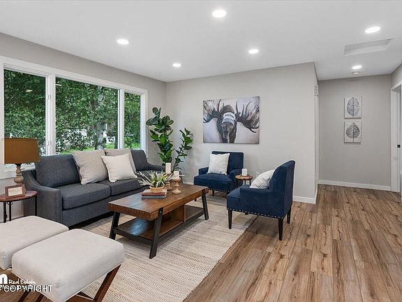 This beautifully remodeled 4-bedroom, 2-bathroom home is located on the east side of Anchorage, just minutes from JBER military base. Nestled in an established neighborhood, this home features a bright, open floor plan with modern updates throughout. The kitchen boasts sleek countertops, stainless steel appliances, and ample cabinet space, while the spacious living area is perfect forboth relaxing and entertaining, plus an additional family room downstairs. All four bedrooms are generously sized, and the two updated bathrooms offer comfort and style. The large backyard is ideal for outdoor activities, and the one-car garage provides additional storage. Conveniently close to schools, parks, and shopping, this move-in-ready home is perfect for families and military personnel alike. Schedule your showing today!