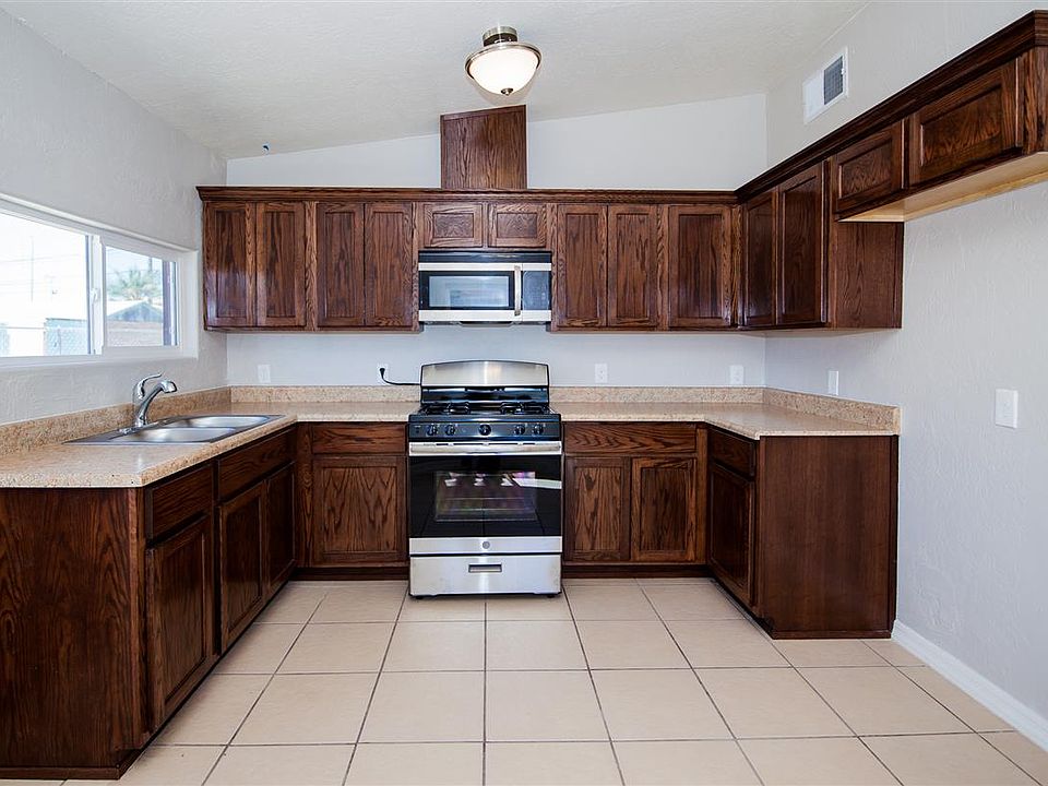 Fully remodeled from top to bottom 3 bedroom 2 bath house for rent off 24th St & Arizona Ave. Tile throughout, no carpet! Brand new gas range. Brand new bathrooms. Brand new windows. Brand new ceiling fans and blinds throughout (blinds being installed this week). Easy desert landscaping (gravel being installed this week). Alley access with front and back double gates for tons of additional parking. Fully fenced property, including front yard. Huge storage shed in back. Cute as a button and won't last long!