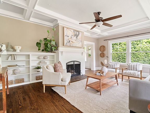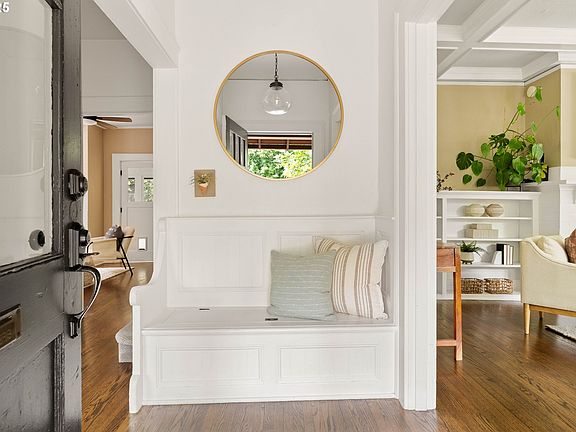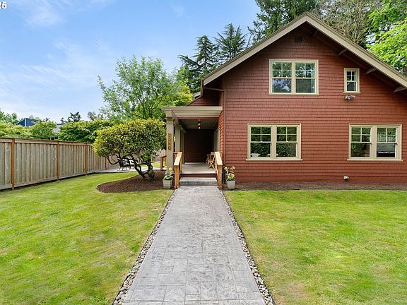 Nestled on a dead-end street in the Markham neighborhood, this 1907 farmhouse on 1/3 acre is truly unique – meticulously updated with modern conveniences while highlighting the original charm of old Portland. The large covered front porch, anchored by a stamped concrete walkway and patio with cedar handrails, highlights the exterior and welcomes you home. Beyond the cozy foyer with built-in storage bench, the expansive living room showcases wall-to-wall windows, allowing natural light to flood the room. Box beam ceilings, built-in bookshelves, solid five-panel doors and refinished oak hardwood floors preserve the authentic character throughout the main floor. Situated between the formal dining room and den/office is the fully remodeled kitchen, featuring quartz countertops, all new cabinetry, custom floating shelves and range hood, and counter-to-ceiling subway tile. A sun room turned laundry room, bedroom and full bath round out the circular main floor and provide an ideal layout for overnight guests and multi-generational living alike. Head upstairs to the spacious primary bedroom, with two walk-in closets equipped with refurbished wood-slat sliding doors, tongue and groove wood paneling, exposed brick chimney and seating area, creating a serene retreat to unwind + relax. The primary en-suite highlights the other side of the exposed chimney along with tiled floors and shower, and custom-built vanity. Two additional bedrooms and one full bath complete the upper floor. The substantial basement provides more than ample storage opportunities, with creative built-in shelving and wine rack leading down the stairs. The detached garage / workshop has room for all your hobbies and outdoor toys, while the generous graveled driveway provides copious parking options. Within walking distance to amenities and top-rated schools, plus easy access to I-5, this SW gem is ready for its new stewards. Listing Agent is the seller. [Home Energy Score = 1. HES Report at https://rpt.greenbuildingregistry.com/hes/OR10238719]