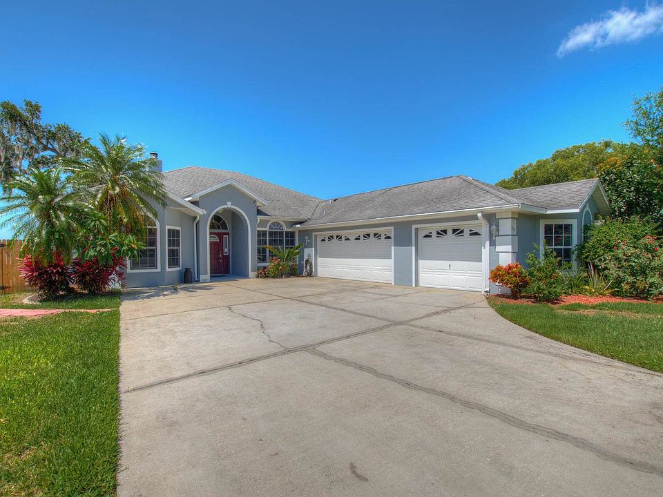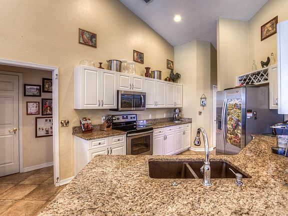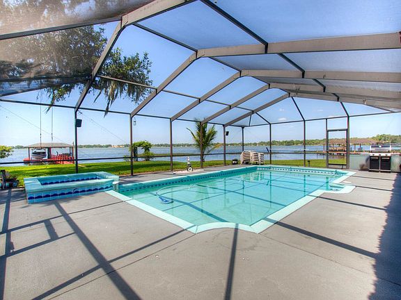 Lakefront Home, offering 4 Bedrooms and 3 bathrooms plus den or office, dining room and dinette with living area. Some Features include: Laminate and ceramic tile flooring. Living room has cathedral ceiling with recessed lighting and wood burning fireplace. Kitchen has granite counter tops with stainless appliances and separate nook. Master suite has double sinks with makeup vanity, garden tub, separate shower and French doors to patio. Secondary bedroom also has access to patio. Screen enclosed heated pool & spa. Mature landscape includes. Palms and Oak trees. Side entry 3 car garage. Situated on 0 .43 acre lot with 90ft frontage on Lake Cannon with boat dock/lift.