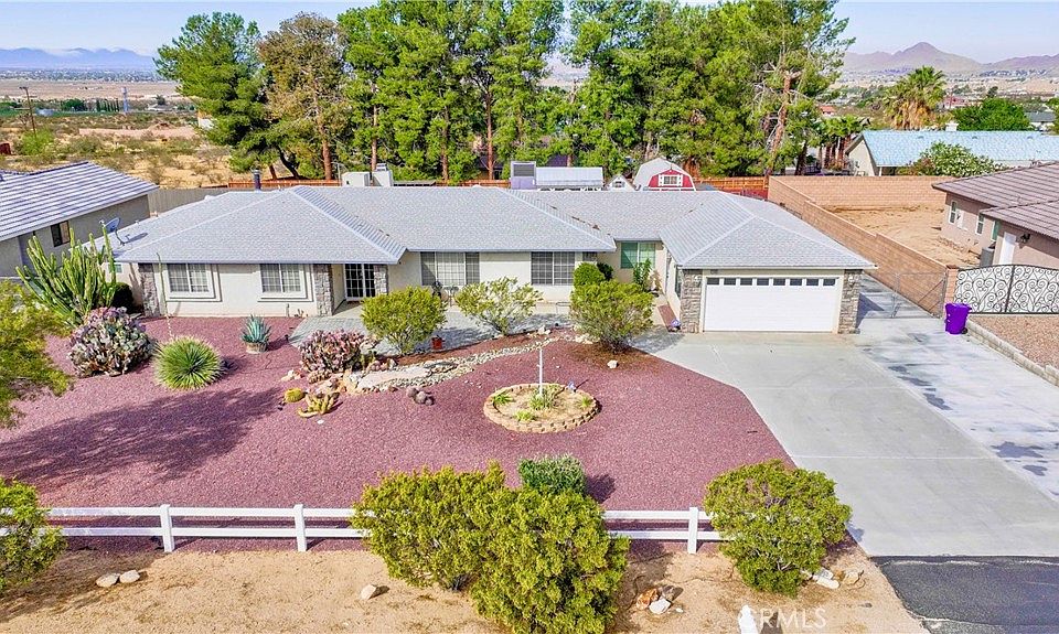 Sunsets over the Sycamore Rocks, back yard BBQ's, RV parking, drive through garage and so much more. You do not want to miss out on this gem. This Apple Valley 3 bedroom, 3 full bath home is way more than meets the eye. Double door entry, open floor plan with living room and formal dining room, breakfast nook and counter bar seating. Granite counter tops, built in oven and microwave. Very large laundry/utility room with an incredible amount of storage and space perfect for home office or hobby room. There are 2 master suites, very large walk in closet, french doors to the landscaped backyard with plenty of covered patio space. 2 barn sheds with electricity perfect for a she shed and work shop. Potting area with water supply for all your gardening needs. This beautiful home really has so much to offer. Newer tile flooring through out, wood blinds, 2 water heaters, swamp cooler as well as central A/C and PAID SOLAR. Do not miss this one.