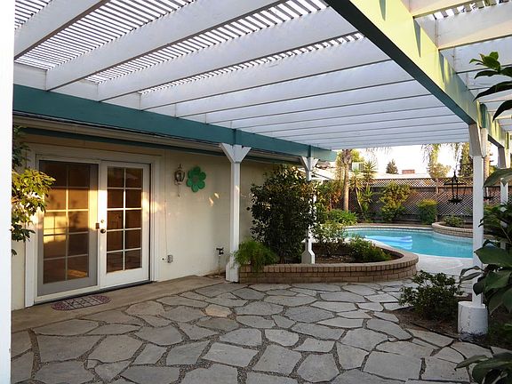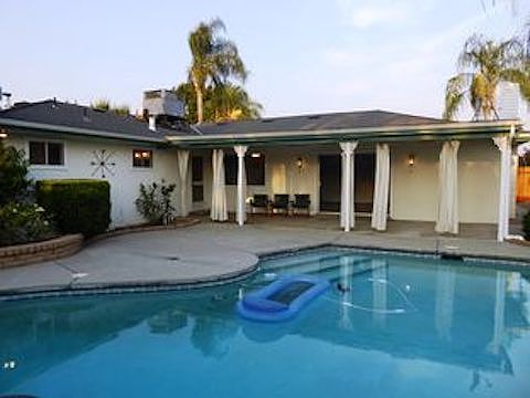 Summer is coming soon. Call 559 288-2963 to see this beautiful landscaping and sparkling pool. Financing Available. The home has been well maintained, with custom cabinetry, hardwood flooring in living room and dining room, carpet in the bedrooms and a wood burning fireplace in the living room; includes a laundry room with a sink along with plenty of storage space and a door leading to the back patio area. The house also offers a master suite complete with beautiful french doors leading to the back patio, double closets with beautiful mirrored doors and double sinks in the master bathroom. And if that's not enough you have your own oasis in the backyard which is surrounded by amazing palms, tropical plants and features a beautiful patio area with a cabana feel, barbecue area and a sparkling swimming pool to beat the heat and hold some memorable summer gatherings.