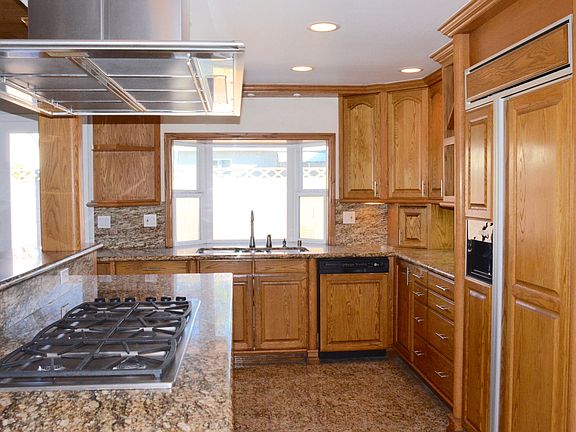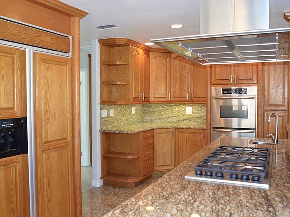 Fabulous single story pool home* totally renovated with modern kitchen w/ custom cabinetry, granite counters, six burner stove, built in refrigerator/freezer and newer appliances, huge island area that opens to the family room*Soaring wood ceiling accents the family room with its rock fireplace and windows overlooking the yard*Formal living room has new flooring, formal dining with sliders to the pool area*Private back yard is accented by the sparkling pool and spa and fully fenced grounds*Freshly painted inside and out*Master bedroom has completely remodeled bath, vaulted wood ceilings*Amenities include ceiling fans, newer windows, new carpet, inside laundry room, walk in closets, built in cabinetry and skylights