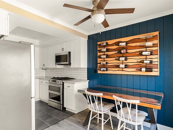 This bright and airy 2-bed, 2-bath townhome features a private courtyard, perfect for enjoying your morning coffee outdoors or hosting a BBQ with friends! The spacious living room features two-story ceilings and a direct view of the beautifully renovated kitchen. There you'll find quartzite countertops, white shaker-style cabinets with black hardware, white subway tile backsplash, a large stainless steel single basin sink, and stainless steel appliances! Wood-look luxury vinyl plank flooring runs throughout the main living area and the generous primary bedroom. Its en suite bathroom features a modern vanity with marble top and an elegant wainscoting detail on the walls. This turnkey home boasts many custom upgrades, including a sparkling tile feature wall with brass sconces in the gorgeously renovated downstairs bathroom, a built-in wine/coffee bar with concrete countertop and marble tile backsplash, and a striking shiplap accent wall in the dining area! There is recessed lighting throughout the home and the bedrooms and dining room are also complete with ceiling fans. You are sure to enjoy the attached 2-car garage with a smart garage opener and laundry hookups. A parking permit also transfers with the property, allowing for first come, first serve parking throughout the community in designated spaces. The Monticello Townhomes Community offers a guest parking lot, two association pools, a spa, and a rentable recreation room for residents, as well water and trash service. Located in the beautiful city of Costa Mesa, minutes from the 55 FWY, Vanguard University, Triangle Square, and the OC Fairgrounds.