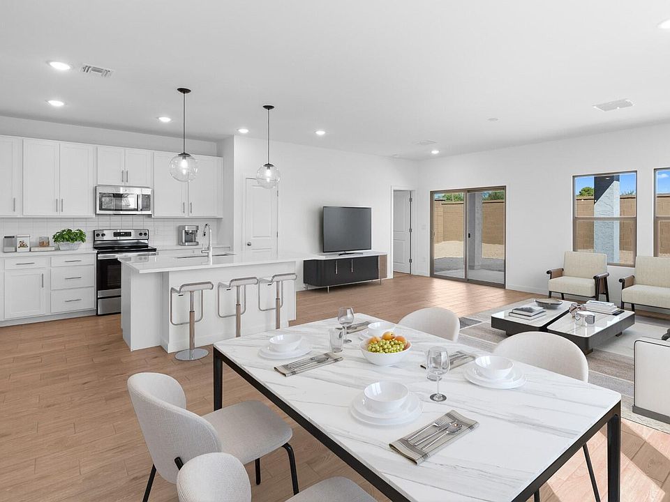 Discover this exquisite single story Godavari plan home with 4-bedrooms and 2-bathrooms in our latest Buckeye community, Monroe Ranch. This home showcases our beautiful Loft inspired 'Looks' interior selections including pristine white 42'' kitchen cabinets, elegant white quartz countertops and wood-look tile flooring. Enjoy the energy saving benefits of spray foam insulation and solar panel readiness, plus water softener pre-plumbed emphasizing both comfort and efficiency. ^^^ Up to 6% of Base Price can be applied towards closing cost and/or short-long term interest rate buydowns when choosing our preferred Lender. Additional eligibility and limited time restrictions apply.