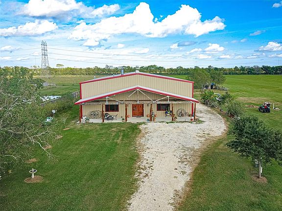 Welcome to sweet country living with a Texas flare! This property has so much to offer containing 10.65 acres of unrestricted land & a beautiful Barndominium single-family home with a pond stocked w/catfish & a small pier for your fishing pleasure. You are welcomed with a large front porch & tall double cedar doors. Open concept floor plan w/spacious family room, high ceilings, stone-accented fireplace, built in book shelves, laminate/wood floors, & lit arche niches just to name a few. Kitchen includes granite counters, wooden cabinets, granite island w/vegetable sink, Thermador 6-burner stove with griddle, double oven & pot filler are perfect for the chef in your home & a breakfast area. The extended walk-in pantry will WOW you w/plenty of shelves & built-in spice rack. The master bedroom w/master bath suite boasts a jacuzzi tub, stand up shower & huge walk-in closet. 5 Ton A/C replaced in 2018, 2 water wells & Bose Surround System. Located off Hwy 288, easy commute to/from Houston.