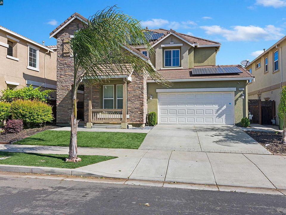 This attractive home is located in the tree-lined streets of Brighton Station. Brighton Station is within walking distance to the Streets of Brentwood, two parks in the neighborhood, restaurants, Sprouts, Raleys, movie theater, clothing stores, close to transportation on Sand Creek and Shady Willow. Fresh painted cabinets throughout the home. Granite kitchen countertops, stainless steel appliances, Bamboo cherrywood colored laminate floors, window covering, complete landscaping, 4th bedroom (downstairs) is currently an office/den, only a half bath on the downstairs/street level floor; Jack-n-Jill bathroom and primary bathroom on second level of home. Artificial grass in front yard, and the backyard has a cement patio and pavers. The solar program is owned and buyer will assume solar lease at time of purchase. The solar company is Sunpower and the monthly cost is $163.39 a month; and finance company is Technology Credit Union (TechCU).