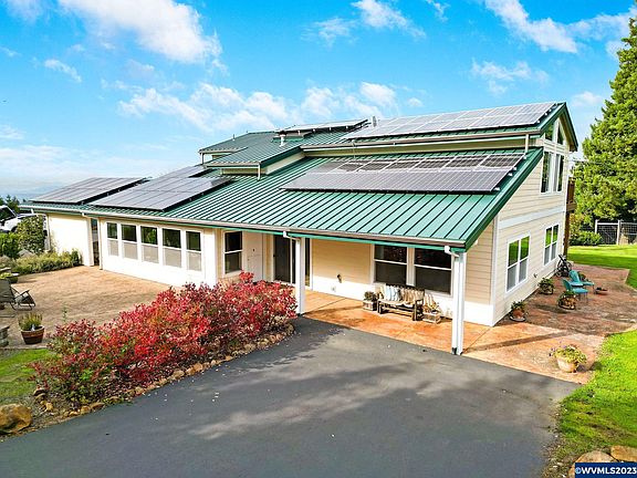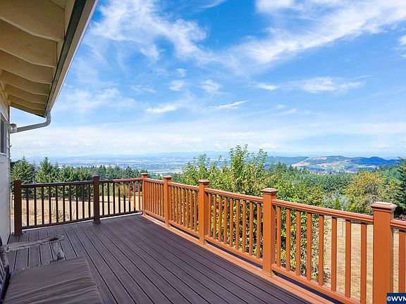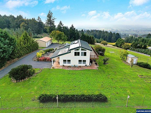 Price Improvement!! Discover this exquisite residence perched atop Eola Hills in Amity's wine country. Amazing valley views to the west and breathtaking mountain views to the east. Entertain on your upper level deck to enjoy both! Energy efficient solar panels and metal roof. Minimal electric bill. Pellet stove to keep you warm in the winter. Beautiful wood floors and quality wood finishes, updated kitchen with stainless steel appliances and granite counters. Extra large shop. One of a kind property!