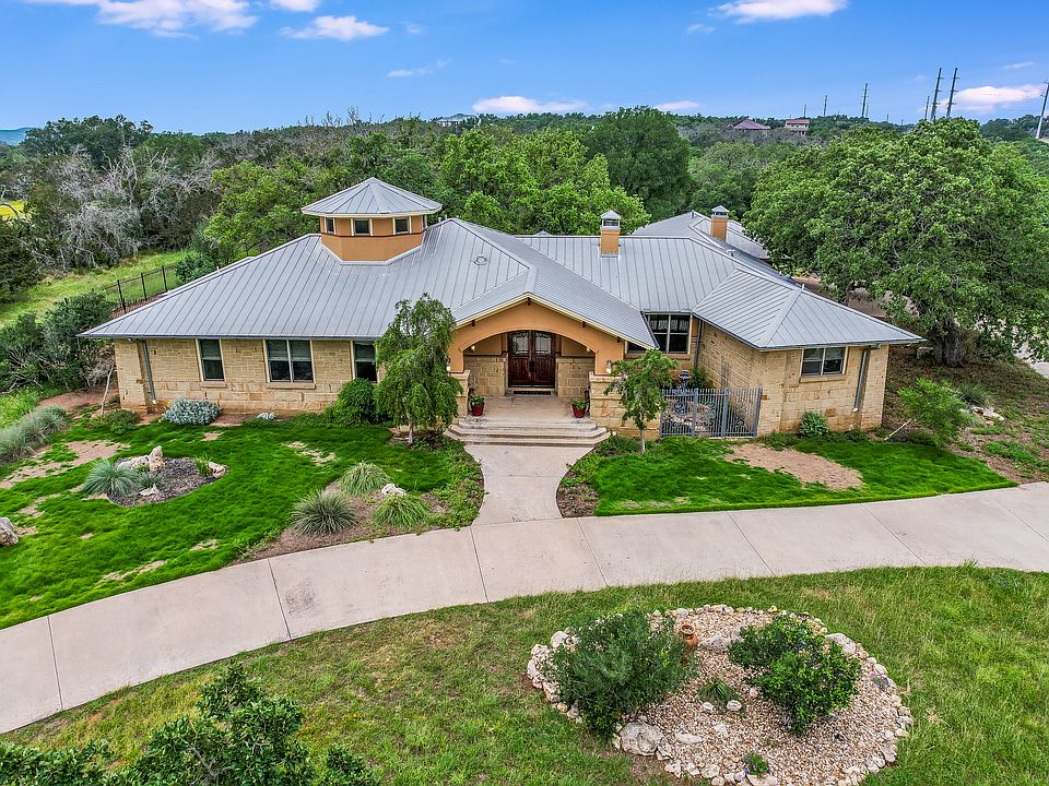 Luxury Sustainable Living in Spicewood. Discover unparalleled elegance in this custom-crafted, single-story residence set on 5.09 acres within the exclusive, gated community of Paleface Ranch. Architectural excellence designed by the award-winning Barley & Pfeiffer architectural firm, this 3862 sq. ft. main house, established in 2006, boasts four bedrooms and three full baths. A separate 1,000 sq ft +/- guest house with an oversized attached garage. Sustainable luxury the property features a unique water system consisting of a 35,500-gallon underground concrete cistern and an 18,000-gallon above-ground cistern. (It is set up so that either house can be on a separate system or both houses can be on the same system.) Elegant Interiors enjoy the grandeur of a rotunda, complemented by travertine and wood floors. The home also includes a screened-in porch ideal for relaxation and outdoor entertainment. The gourmet kitchen is a chef's dream, featuring a unique island with a Kohler-designed apron sink, seating storage, a Viking built-in side-by-side stainless refrigerator, a Gaggenau steam oven, a convection oven, and an ice maker. It opens to the dining room, which shares a see-through fireplace with the living room for a cozy and connected ambiance. Outdoor Oasis Perfect for equine enthusiasts, the estate allows for horses and a lush garden space. Exclusive Amenities Residents enjoy private community boat ramp access—experience luxury, sustainability, and community charm all minutes from shopping, restaurants, private airport, and local farmers markets.