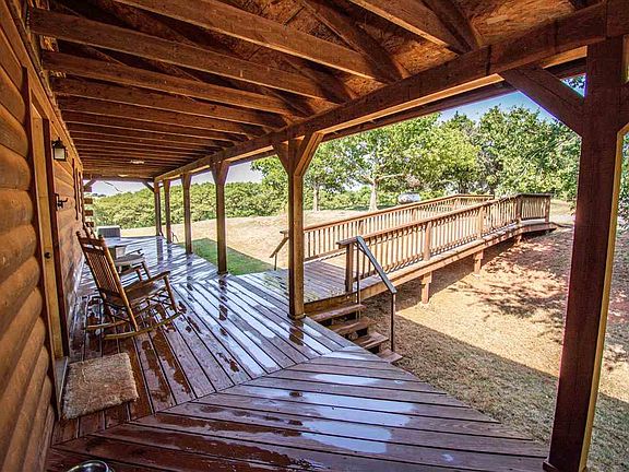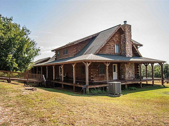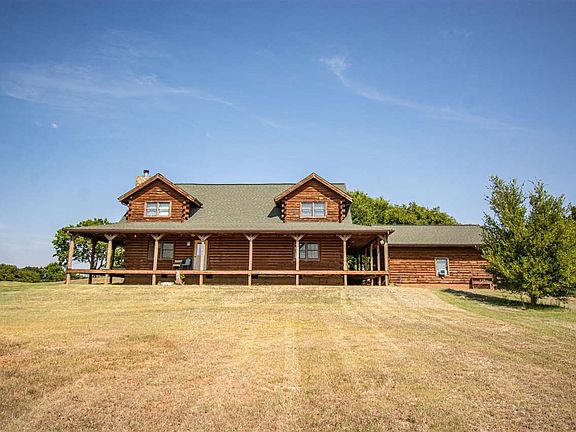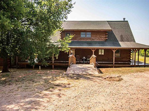 Welcome to your cabin on the hill. Overlooking a gorgeous 4 acre homestead you will find this truly immaculate 2 story log cabin. Spacious & well planned, no detail went overlooked. There is room for everyone! The open & inviting main level, including the Primary Bedroom, Family Room & Kitchen has access to the gorgeous wrap around porch offering breathtaking views. The 2nd level has the 2 spacious bedrooms with ample closet space, a 2nd living area perfect for guests or kids, a sitting /reading nook, & full bathroom. This home also boasts a perfect space made for a home office or additional sleeping space. Also located on the property is a sturdy 30'x50' steel frame shop with concrete slab, electric ran throughout, and two overhead doors. The shop also has water plumbed to it for a bathroom making it easy for you to hook up and install. The detached oversized 2 car garage has an in ground storm shelter for that added peace of mind. You will surely be impressed with this one. Call now to stake your claim and make this one yours!