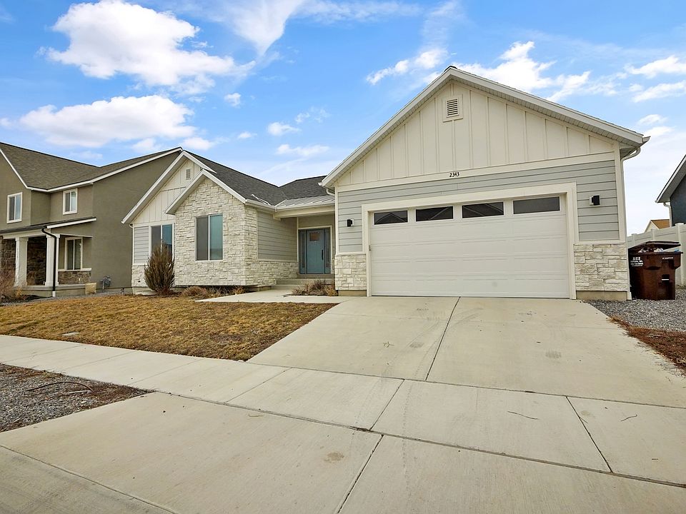 The primary suite is designed with its own private deck and an ensuite bathroom featuring both a shower and a soaking tub, offering a peaceful retreat at the end of the day. Two additional bedrooms and a full bathroom provide flexibility for a variety of living arrangements. The unfinished basement offers ample additional storage space, keeping the main living areas uncluttered. All landscaping is complete, making this home low-maintenance and move-in ready in a desirable Eagle Mountain location.