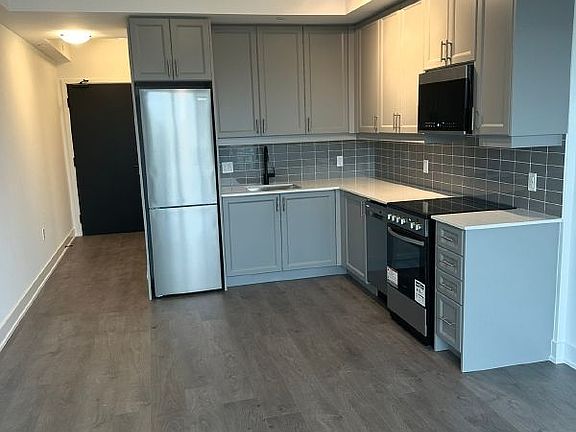 Open concept kitchenModern kitchenQuartz countertopsTile backsplashStainless-steel appliancesFloor-to-ceiling windowEnsuite laundry