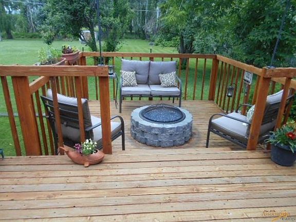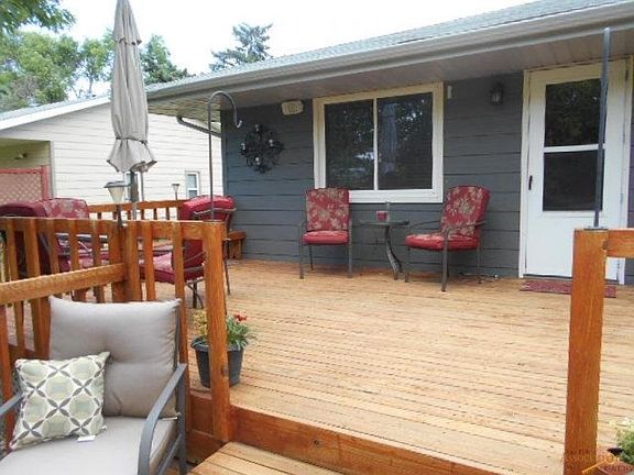 Don't miss out on this well maintained five bedroom (2 downstairs not to code) home, with lots of great features, in Rapid Valley. Newer siding, newer windows, central air, updated kitchen, with under counter lighting, newer appliances, built in microwave, a gas range, solid surface counter tops and a large pantry. There's a sprinkler system in front and back and water is pumped from the irrigation ditch (at a small yearly charge), mature apple and pear trees, with mature grape vines, roses and lavender that come up every year. A beautiful 20x12 tiered deck with deck lighting all around and a built in gas fire pit. Downstairs there's new carpeting, a gas fireplace, a workshop room, bar with refrigerator, and tons of storage. You also have built in speakers in the living room, kitchen, down stairs, and outside, and video telephone for front door. Wood floors are under carpet in living room, hallway, and upstairs bedrooms.