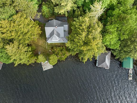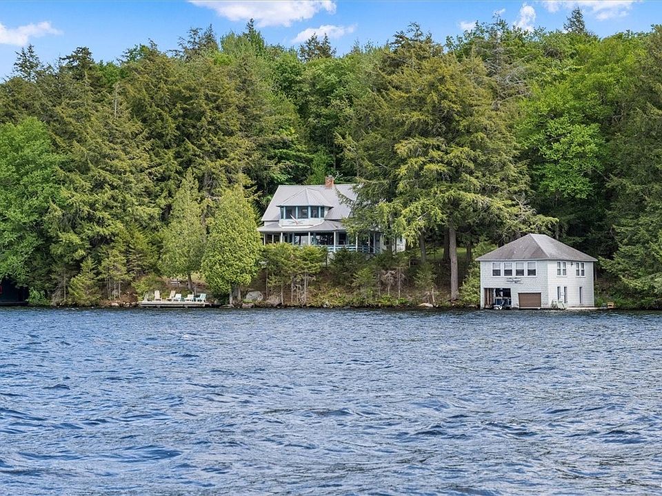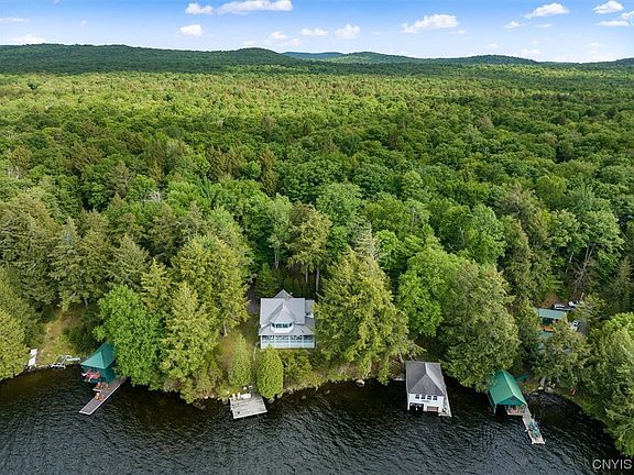 Spectacular "Ski-Side," the Adirondack lakeside retreat built by Vice Presidents James Schoolcraft Sherman's brother in 1903, is perfectly perched on 230 feet of prime South Shore Waterfront.  Breathtaking vistas of beautiful Fourth Lake await!!. The main house with a captivating wide main level porch pulls you, as does the fireplaced living room with never-ending vistas of mountains, lake, and wildlife.  4 Bedrooms and three ample baths make housing a crowd uncomplicated.  The tasteful restyled kitchen brings convenience and appropriate design to satisfy the culinary star.  The oversized Master enjoys its own lakeside porch commanding prime seats for three seasons of lake life.  The meandering grounds lead to the historic boathouse apartment Juxtapositioned over the bay, which is sure to be a love at first sight...with an additional two-bedroom and bath, it is hard to imagine that owners or guests wouldn't delight in this charming nest. Below, the outfitted boathouse houses the included newer party barge, kayaks, and dockage for several watercraft, storage abounds, with included acreage across the road for build-ability or separation. Offered furnished. Rare, Historic & Refined.