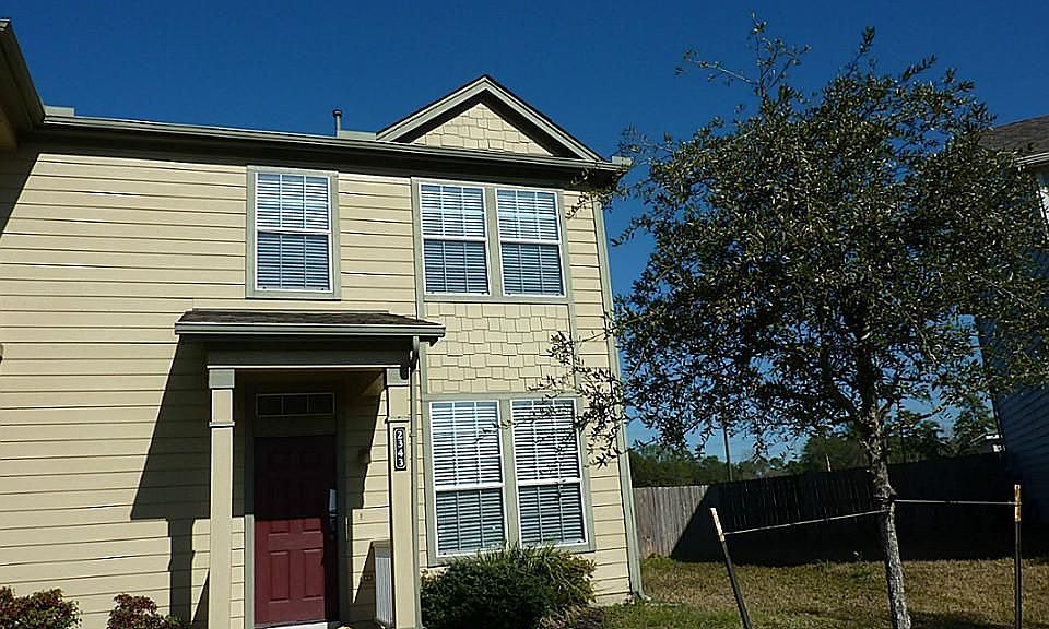 2 bedrooms, 2.5 baths. Tiled kitchen with island, laminate counters, gas range and oven. Tiled guest half bath down. 2 bedrooms with carpeted flooring, each with its own bathroom. First bathroom has vinyl flooring, tub and shower, second bathroom has vinyl flooring, shower only. Utility room up