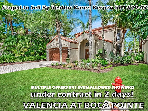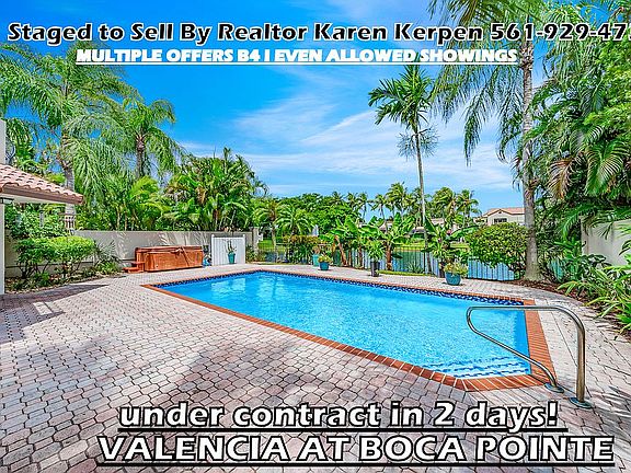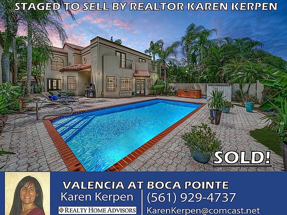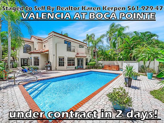 Wow! Spectacular Mediterranean waterfront & pool home features 4 bedrooms, 2.5 baths and 2 car garage. Located in the prestigious community of Valencia at Boca Pointe with tons of landscaping, grassy area and more! Dramatic entrance w/soaring high, volume ceilings. Enjoy the sense of openness, volume, & space. Tile flooring on a diagonal throughout the downstairs living area. New LED lighting throughout. Everything is oversized....Huge living and dining room...family room off kitchen has a sunny eat-in breakfast nook, Newer GE Stainless Appliances including French door refrigerator, dishwasher, convection oven/microwave plus induction range. Tons of Recessed LED lighting, a breakfast bar, & pantry. The master suite is downstairs and features double door entry, wood look tile flooring, enormous His & Hers Walk in closets with built-ins, impact French doors lead to patio/pool area, custom blinds/shades for French doors and window. Stairway and all of the upstairs has new dark wood laminate flooring. Large loft upstairs is a huge bedroom (just currently open) and 2 other large bedrooms upstairs both with French doors that lead to a balcony that overlook your private resort pool & lake and have phantom screens. That way, in the rare event that we ever have a cold day, you can open the doors. Paved driveway, paved patio & whimsical paved walk ways.Tons of French doors all leading to the amazing tropical oasis back yard. Private back yard w/saltwater sparkling pool. Heated pool heater in plus extended patio, & a great lake in back. Fully fenced in. Lush landscaping just added. Move the party outside & go from the front of the house to the back through the side pathway/walkway past incredible plants and trees. Backyard/perfect for entertaining or relaxing. Large Pool was recently refinished plus new glass tile & salt water system all done in 2018. Hunter Douglas shades. Newer tile roof from 2008. High Seer Carrier 2 A/C's May 2015 (2 zones). Water heater 2017. Coolest garage ever w/metallic epoxy floor & LED lighting. Large inside laundry room features LG Front loader Ultra large capacity TurboWash washer and Ultra large capacity Steam dryer from 2017. Valencia is a man gated community. You cant help but notice all the mature trees as you drive in. HOA includes lawn/landscape trimming, tree trimming, cable with HBO, trash collection, exterior house paint, & alarm maintenance and monitoring. 24-hour manned and gated entrance. All ages ok! Pet friendly community. Amazing schools! Boca Pointe Club Membership is OPTIONAL not mandatory.