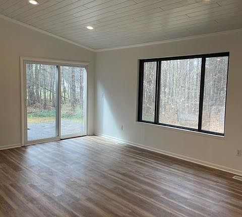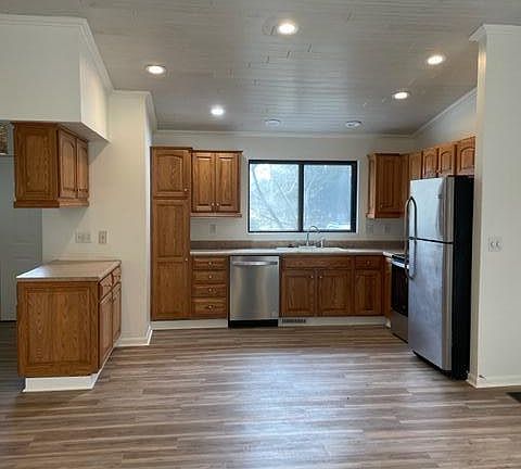 This lovely, frame built ranch is situated on two large lots totaling 1.75 acres. An open concept living and kitchen area are accentuated by vaulted ceilings. This two bedroom, one bath home features new flooring, paint, appliances, lighting, and more! Enjoy the wooded serenity of the backyard on the deck. The property has excellent proximity to town without the city taxes. The full basement has potential to be finished or used for plenty of storage. Call today for your private showing!