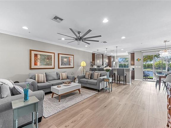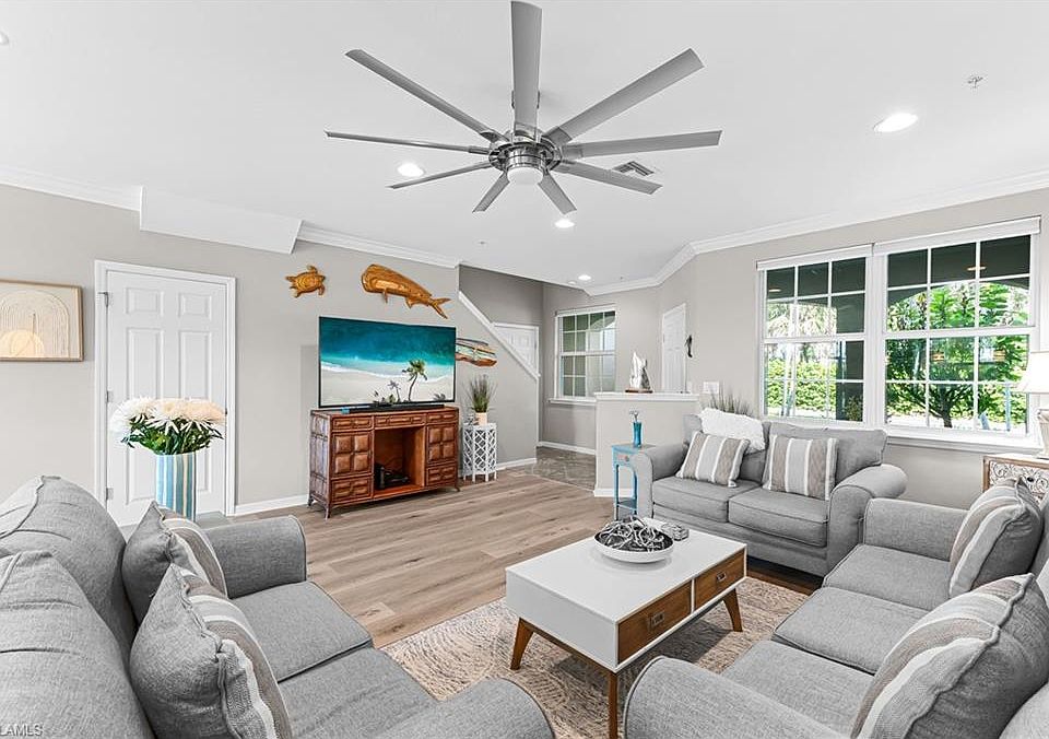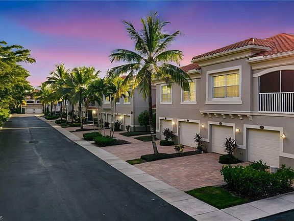 Welcome to this beautiful, move-in-ready townhouse located in the meticulously maintained community of Mirasol at Coconut Point. This rare townhouse offers two single-car attached garages ideal for storing bikes, golf clubs, and beach essentials, complemented by two private driveways that offer extra parking for guests. The home features new impact windows (2023) and a new A/C unit (2023), providing peace of mind and energy efficiency. The kitchen is both spacious and functional, featuring granite countertops, 42” upper cabinets, and stainless steel appliances, including a new refrigerator. It's the perfect space for cooking and entertaining. Just off the kitchen, the dining area overlooks a serene lake view, while the living room offers plenty of space to relax or host guests. Upstairs, you’ll find a thoughtfully designed layout with a large master suite, two guest bedrooms, a guest bathroom, and a laundry room. The master suite includes an en-suite bath and a generously sized walk-in closet. Best of all, the upper-level layout ensures no noise from above—adding to the peaceful ambiance. Step outside to enjoy the screened-in patio, your private retreat with breathtaking lake views, gorgeous sunsets, and the calming sound of the fountain. The entire community received new roofs in 2022, and Mirasol offers a true maintenance-free lifestyle. Your condo fees cover water, Xfinity cable and internet, building insurance, exterior maintenance, lawn care, landscaping, and irrigation. Enjoy access to resort-style amenities, including a heated pool with a cascading waterfall, spa, covered bar and grill area, bocce court, and a clubhouse featuring billiards, a kitchenette, and a fitness center. Location is everything—Coconut Point Mall is just a short walk from your front door, and Lee Health Medical Facility is right across the street. You’re also just minutes from Southwest Florida's beautiful beaches, RSW airport, and best of all, Mirasol has never experienced flooding. This home truly has it all. Schedule your private showing today!