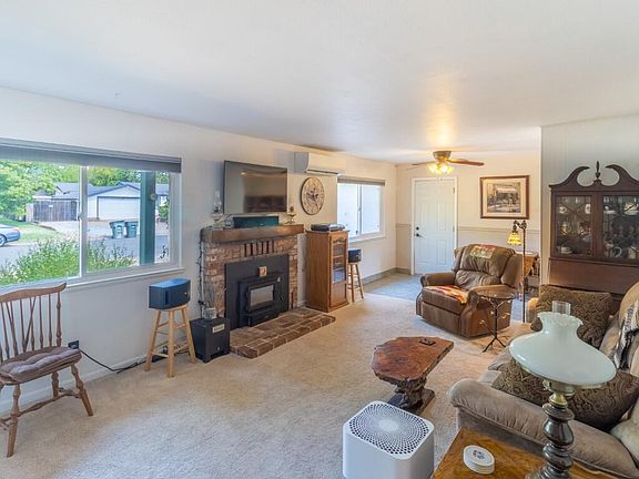 Welcome Home! This lovely very clean homeis ready! Updated Kitchen and Bathroom, Dual pane windows with upgraded window coverings, heat pump efficient, evaporate cooling too. Brick fireplace/wood stove insert and a gas wall heater. Roof is approx only2 years old. Covered back patio, garden boxes, pottingstorage shed.All appliances are included, auto garage door opener.Very convenient location, shopping and easy access to Hwy 44 and I-5.