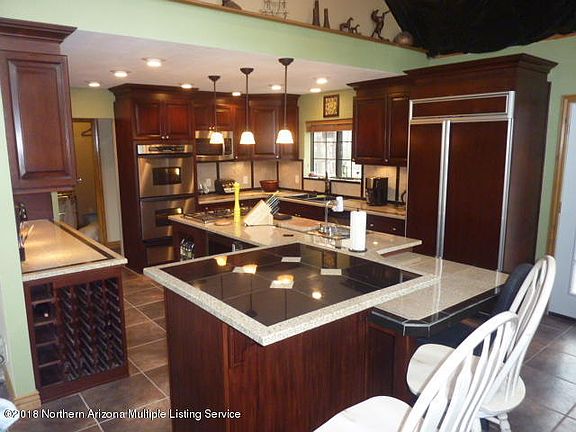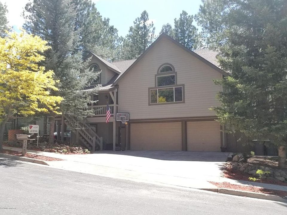 This beauty nestled in the pines, is just a few minutes from downtown is located in a beautiful and quiet premier Westside neighborhood , only minutes from downtown Flagstaff and Snowbowl. The outstanding features include 4 bedrooms, 3 baths w 3 car garage. As you step inside a spacious living room with a woodstove and an incredible custom rock water fall feature set with Breath taking views from the new energy efficient Milgard Vinyl Low E double pane windows throughout the home. A beautiful north facing wall of windows in the dining and great room including an amazing 20ft cathedral knotty pine Tongue and groove ceiling with recessed lighting throughout, and custom paint, New knotty pine doors and custom wood trim all make for a very unique great room. The Kitchen oh my my,