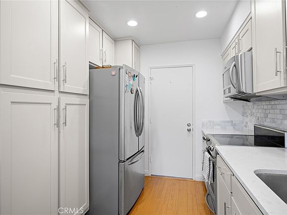 This upgraded, turn key, corner unit is filled with ample natural light and large windows with plantation shutters. Upgraded kitchen has quartz countertops with stainless steel appliances. Plantation shutters and duel paned windows through out home. Large closets with ample storage and built in shelves. 2 car, side by side parking, guest parking in garage, heated pool and sauna. HOA dues include earthquake insurance, hot/cold water and gas. You only pay for internet and electricity.