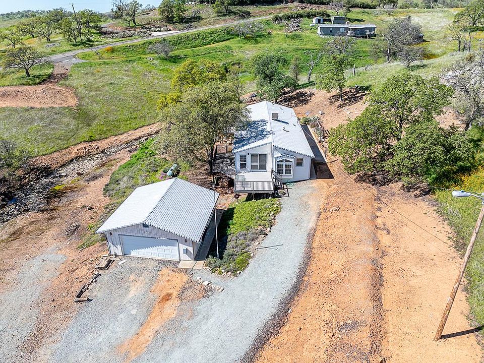 Looking for a peaceful retreat with a seasonal stream? The setting is lovely on this little gem that sits on over 2 acres on a corner lot. Enjoy the view of the Hills and the Valley while lounging on one of the two decks! Spacious living room with cathedral ceiling, dining room, large kitchen with island, granite counters, bar, stainless appliances, and beautiful vinyl plank floors. 2 nice size bedrooms, primary suite has updated bathroom. Laundry room is accessible thru the back door in case you're muddy from working outside in your garden. Space for freezer, and cabinets. 2 car detached garage with shelving. 50 AMP RV service, Gated entry and room to add in a horse area or a shop! Located between 3 large lakes, close to gold mining towns, miles of riding trails for the horse lover & not too far to commute. Community pool, gym, BBQ, Clubhouse included. Please take a Virtual tour!