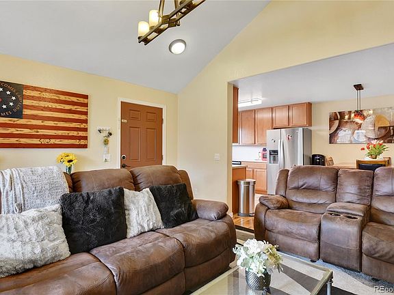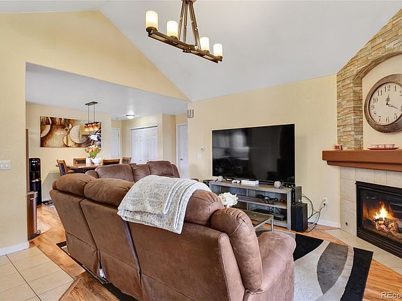 Truly one of the best locations in Aurora at Cross Creek! This beautiful, well-maintained, top floor end unit is 1 of only 4 of its kind within this 96-unit community that's not adjacent to a public street or road. Instead, the south-facing covered deck for this penthouse unit overlooks the BEST greenspace in Cross Creek. Just a short distance from your 1-car detached garage is the fully covered stairway, making it easy in any season to enter one of the most private and secure units in the community. This home has a great open floor plan with vaulted ceilings throughout, gorgeous upgraded hardwood plank flooring, upgraded custom light fixtures, central air conditioning, a cozy fireplace, and a new hot water heater. The kitchen includes newer stainless appliances, 42" cabinets, double sink, and plenty of counter space. The large primary bedroom includes a vaulted ceiling, en-suite full bath, and a large walk-in closet. A second bedroom with another vaulted ceiling, as well as a second full bath, are located on the opposite side of the unit. The community offers a fantastic swimming pool, clubhouse, playground, and sport court. Super easy access to E-470, I-70, and only minutes to DIA and Buckley Space Force Base. Move-in ready top floor end units overlooking greenspace are seldom available in Cross Creek.
