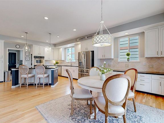 Charming 5 bed/5 bath + study executive home with a finished walkout basement located on the 4th green of the Black Bear Golf Course! Arguably one of the best lots in Canterberry with stunning sunrise and golf course views, a big yard with mature trees, and 3 separate outdoor entertaining areas. Beautifully updated with a spacious white kitchen featuring a center island, loads of cabinet space, breakfast nook, stainless appliances including gas stove and double ovens, built in desk, and custom lighting. Open kitchen flows seamlessly into the inviting living area with an elegant corner fireplace and abundant windows providing lots of natural light and golf course views. Private main floor study with french doors, dedicated dining space perfect for entertaining, a powder bath and updated laundry/mudroom with custom tile and utility sink round out the main level. Upstairs you will find 4 spacious bedrooms including the huge primary suite with vaulted ceiling and an ambient pass through fireplace into the spa like bath. En suite bath offers dual vanities, large walk in shower, jetted tub and walk in closet. 2 additional secondary bedrooms share a functional jack n jill bath and a 4rd bedroom has a private en-suite bathroom; all 3 secondary bedrooms offering big walk in closets. The full finished basement is loaded with character featuring a saloon style wet bar which boasts a full size fridge and dishwasher; a well appointed dining/poker space, a second living room with exposed brick accent wall, a large 5th bedroom with attached 3/4 bath, swanky media room with shiplap wall and barn door closure, and a super cool "studio" work space with exposed brick wall and utility sink (could be 6th bedroom). Basement walks out to an inviting covered patio space with and extended paver patio beyond. You will be wowed by the fantastic views and the excellent privacy! East backing for prime enjoyment in the warmer months and west facing for quick snow melt in the winter.