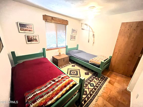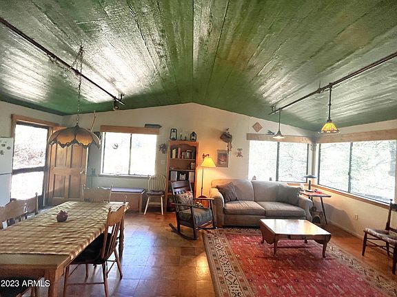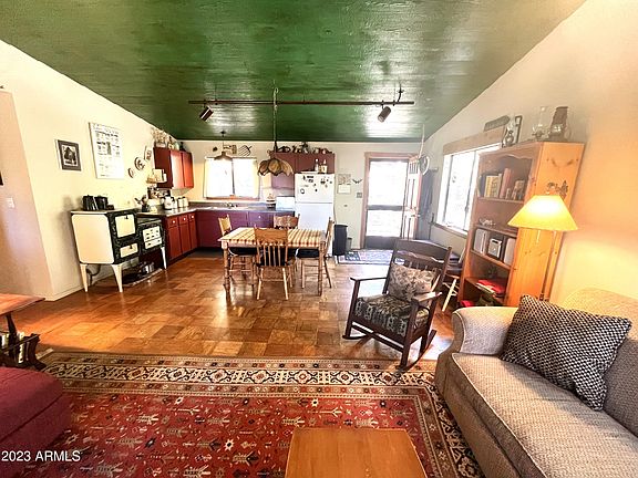 Original owners hate to part with this hillside rustic gem! This quality built cabin is situated on the dead end of a quiet street. The large deck is perfect for entertaining with beautiful views of the tall pines of Crown King. This cabin is the perfect place to spend the holidays with year year round access. There are two spacious bedrooms, and inside laundry. Living area is a large great room with open floor plan. You will find a large finished workshop room under the house with workbenches and tons of storage. Antique propane cookstove does not convey. This home has it all! Beautiful wood floors and wood ceiling gives this home warmth and charm. Municipal water, electric, and septic. Come & see what makes Crown King such a popular mountain community.