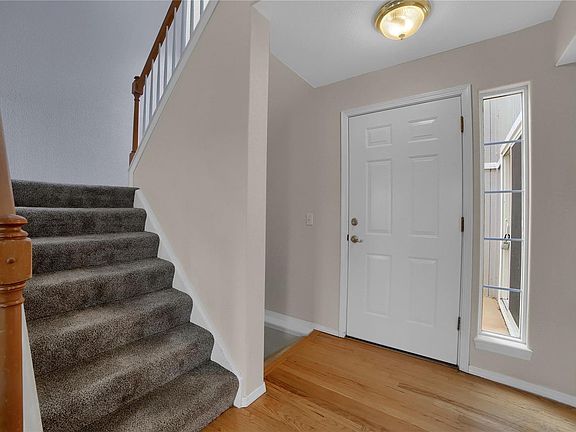 Darling townhouse backing to open space! Within just steps of High Plains Elementary School and near Rampart Park, this home is in a perfect location. Beautiful entryway w/ wood floors opens up immediately into the great room w/ a 2 story vaulted ceilings, newer carpet, a gas fireplace accented with brick and gorgeous mantle, and views of the open space! Enjoy summer evenings on the large 15x30 composite deck overlooking the open space and park! The kitchen is adorned with solid surface counters, a spacious pantry, and adjoining dining area! Also located on the main level are a 1/2 bath and the laundry area! The upper level features the master bedroom with a vaulted ceiling, double closets, and an attached 3/4 bath! Two additional bedrooms are located on the upper level along with a full bath and linen closet! The unfinished walkout basement provides a perfect area for workbench, exercise equipment, or a future living area with pre-plumbing for a bathroom and a covered patio!