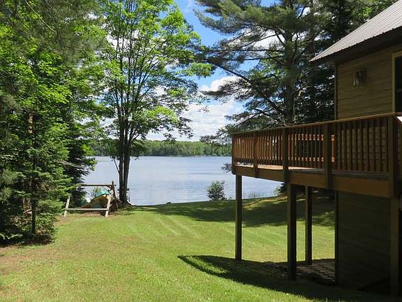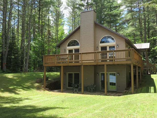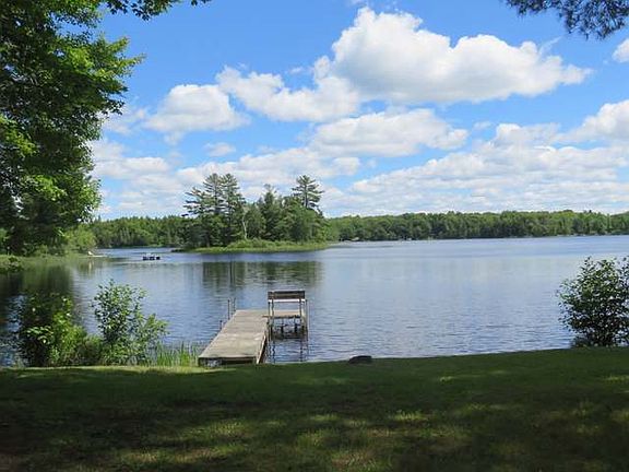 Newer & cozy maintenance free home with 100 feet frontage on desired Long Lake with 4 private wooded acres. 3BR, 2BA open concept home has Great Room with cathedral ceilings, wood burning fireplace and french doors leading to lake side deck. Kitchen has tons of cabinet space with Oak cabinetry & breakfast bar. Room for a dishwasher if you want! Kitchen is open to the dining area with french doors to lake side deck. Master bedroom with his/her closets (one is a walk-in), full bath with laundry room complete main floor. Lower level walkout has Family room & rec room area with pool table - it's included! Full bath with tile flooring, 2 bedrooms and utility room. Efficient Hydronic hot water heat system and gas water heater. Exterior grounds are level to the lake front with beautiful sand swimming frontage and gorgeous view overlooking an island, nice wrap around deck & covered patio. Car port and shed offer great storage.