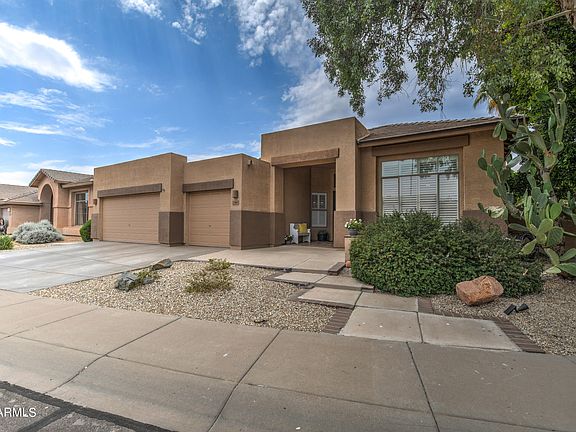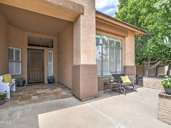 This home shows like a model and checks all the boxes. Located on a corner lot with a vey private yard, enter into the expansive foyer with travertine tile in all traffic areas. There is a large formal living room and separate dining room for entertaining, and the open kitchen/ great room with soaring vaulted ceilings is perfect for gatherings. Granite countertops, large center island, rich dark 42'' cabinets, newer SS appliances, and plenty of counterspace are a chefs delight. The split flooplan offers plenty of privacy- the primary suite features a large walk-in closet with extra shelving, separate shower and deep soaking tub, dual sinks, as well as a makeup station. All bedrooms have new wood plank tile and ceiling fans. Outside, enjoy the salt water pebble-tech pool and ramada. Ac units were replaced in 2018 (Goodman) and 2021 (Trane). Roof underlayment completely replaced in 2020, flat section over entrance recoated in 2024, Gas H2O tank in 2022, Interior paint and appliances in 2018. There are plantation shutters and sunscreens for energy efficiency. Soft water and R/O system, utility sink in the laundry room with gas dryer, epoxy floors in garage w/ overhead storage racks, 10' ceilings throughout the home, 6" baseboards, and so much more!