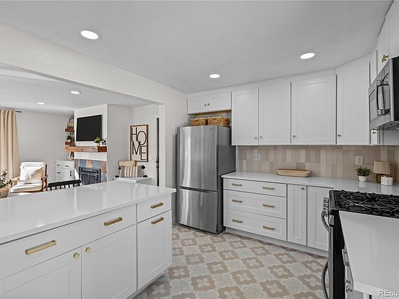 NEW kitchen (Sept 2023) with NEW cabinets (drawers big enough for pots and pans), QUARTZ counters, stainless steel chef’s sink, brass faucet, brass hardware, vertical ceramic tile backsplash, lighting, and stainless refrigerator. There is even a peninsula with bar seating for 4!
