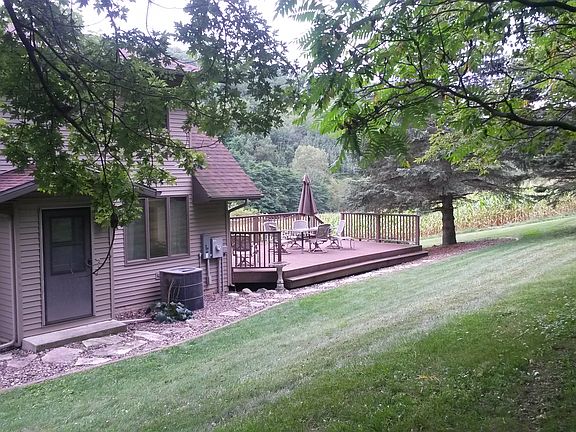 Get the best of all worlds! A beautiful country home with prime deer and turkey hunting and tillable acreage. New archery State record whitetail taken in this valley in 2015. See below trail cam photos of the State bow record deer and some of his relatives on this property! Beautiful coulee setting 20 minutes from Valley View Mall. Open air concept country home. 4 bedroom, 2.5 bath, two story on 112 acres (40 tillable) in a beautiful coulee near Rockland, WI. Well kept. 2,453 sq. ft. finished living area, 1,541 sq. ft. basement; spacious gourmet kitchen with Jenn-Air gas range top and prep sink on island, Bosch double oven; real red oak flooring, Amish oak cabinetry, large picture window with fantastic views on every level; spacious bedrooms; walk-in closets; large laundry area; office/gym area; lots of storage; attached heated two car garage, paved driveway; outdoor wood heat boiler (house, water, + garage); large bi-level composite deck with 24-foot heated (LP) above ground pool overlooking the coulee; new water heater and water softener; central vacuum; guest house/storage, outbuildings. Appointments to view the property should be set up by calling Randy Burkhardt (608) 317-7802.