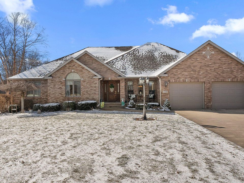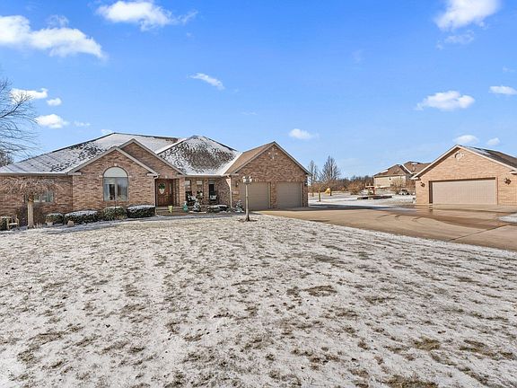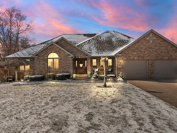 This is a beautiful custom built 3 br,4 bath open concept ranch with brick and vinyl siding, a two car attached and an additional 2 car garage !Home offers a large entry foyer off main entrance looking into formal dining, and wide open living room with a brick fireplace. The garage entrance opens into a mudroom/main floor laundry, 1/2 bath and an large eat in kitchen with a supersized island perfect for food prep, oversized refrigerator/freezer and loads of cabinetry.Your view is a lovely back yard and access to your huge deck with pergola for warm weather dining and relaxing!The primary bedroom is an ensuite with a massive walk in closet!The other two bedrooms share another full bath. The basement is mostly finished with plenty of finished living space, including pool table, fireplace,wet bar, tons of storage in addition to two finished rooms set up as bedrooms but not true egress. A 3/4 bath is a great addition for gatherings. Zoned heating plus salt tank for water softener located in garage for easy salt installingThe child's swingset will not stay. Subject to seller's closing on home of their choice that they have an accepted contingency agreement