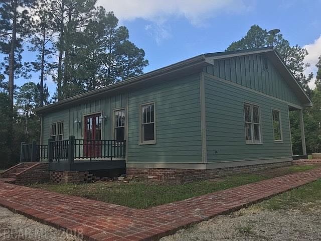 Country Living and Charm at it's best. Almost 3 acres of peace and quiet- you won't want to leave home! But if you do, you are only minutes from OWA, Foley, and the beaches of Gulf Shores and Orange Beach. This original, one of a kind, craftsman style home was taken down to the studs and rebuilt in 2008 with new plumbing and new wiring, new appliances and cabinets, and new kitchen and bathrooms. Many custom built qualities, including built in cabinets and shelves throughout! Tongue and Groove Maple hardwood floor in the Master BR, bamboo flooring and tile, and less than 1 yr. old carpet in 2 Front rooms. Wide brick sidewalks encompass two sides of the home, with 4 porches for taking in the tranquility! 4 Br, with an extra room that could be a 5th BR or an office. Split floor-plan with an additional Kid's TV/Play area off of the guest bedrooms. Floored 40x16 attic space for tons of storage! Spacious, open yard, bordered in trees for peace and quiet. Double Driveways, one going to front of home, the second to the 20x15 workshop. Two workshops- His and Hers! Larger with 220 amp, and smaller workshop with sink and electricity. Home Warranty and Termite Bond.