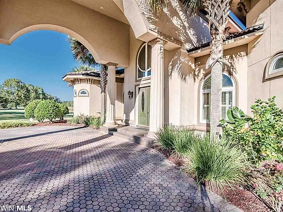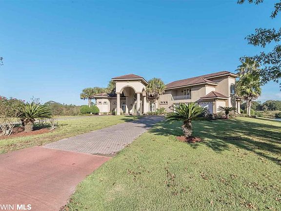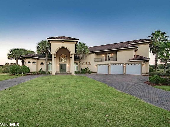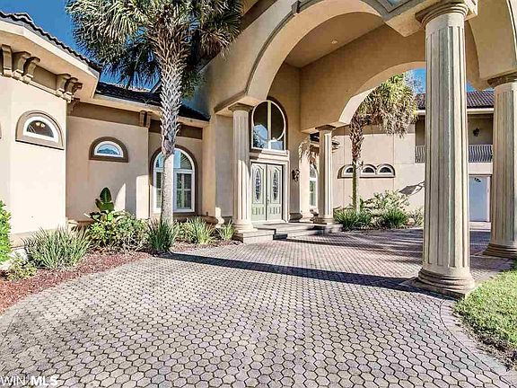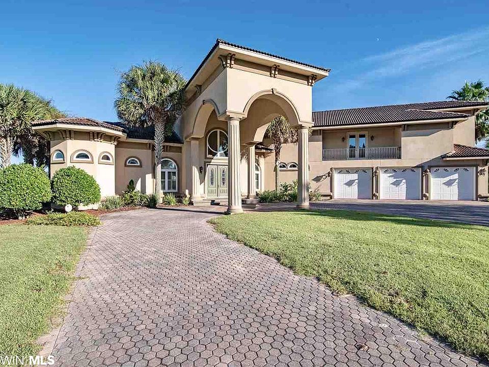 Peace and serenity abound in this luxurious mediterranean oasis. Away from the crowds, you'll find this home very convenient and only minutes to Owa, shopping, dining, and close to the beach. This beautiful home sits on over 1.5 acres with sweeping water views. Follow your beautifully landscaped steps down to the waters edge. No expense was spared in the concept of this custom built home! Upon entering through the portico, you are greeted with a spacious floorpan featuring tile floors, 12 ft ceilings, and 8 ft solid core doors. Boasting over 5,000 sq ft, this impressive home is complete with a formal living and dining room, den, breakfast nook, 4 bedrooms and 5 full baths, office, security system, central vacuum, and a water softener/filtration system. There is also plenty of room to entertain in the additional living area where you will find a fully vented gas grill and wet bar, ice maker, refrigerator and sink/bar that overlooks the enclosed heated pool and hot tub adjacent to the back of the house. The open kitchen design features a Viking gas cooktop, granite countertops, double ovens, double dishwasher, large refrigerator, garbage disposal and trash compactor. You will find that the kitchen has ample storage including a walk-in pantry, lots of cabinet and counter space complete with a wine chiller. The master bedroom is conveniently located on the main floor and provides sweeping views of the lake and pool area and provides a pampering ensuite bathroom with a large, open walk-in shower, jetted tub, two separate vanity areas and two walk in closets. Many intricate details in this home include custom trim work, tile, and tray ceilings with inlaid LED lighting and speakers throughout the home. Moving up the grand, wrought iron staircase, you will find the second master suite, complete with a balcony overlooking the lush landscaped front yard. Three car garage allows for extra storage. Home also has a 25,000 watt in home generator. OWNER FINANCING AVAIL