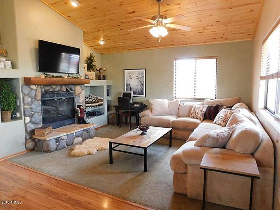 Tranquility & Relaxation! This 2BR, 2BA cabin (Bear Model) in Bison Ranch exudes warmth the minute you enter. T&G vaulted ceiling, river rock fireplace, decorator paint touches & newer appliances make it a great weekend retreat or full time home. Log sided, low maintenance metal roof, shed for the toys & private feel too. Enjoy the sounds of the babbling brook & pond from the rear deck while the kids, family or friends fish from the catch-n-release lake w/community playground & Ramada or play tennis & basketball. There's also nearby shops, restaurant & seasonal rental horseback riding stables. Bison Ranch is just right for the entire family!
