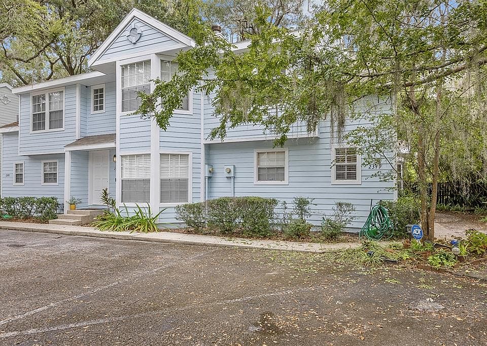 Adorable end-unit townhome in one of the most centrally located areas in Gainesville! This charming 2-bedroom, 2-bathroom residence nestled in the highly sought-after community of Carriage House Lane is now on the market, and can be yours. As you step inside, you'll be greeted by the warmth and comfort of this delightful home. The spacious living room welcomes you with Italian ceramic tile and a cozy fireplace, making it the perfect spot for relaxation during chilly evenings. Walk up the solid oak staircase and you'll find two generously sized bedrooms that offer an abundance of closet space. The home boasts no carpet in the entire unit, newer AC, newer beautiful oak laminate floors upstairs, a fresh and updated hardie board plank exterior, updated in 2020, giving your new home a modern and stylish look. With 2 assigned parking spaces and 2 private upstairs half baths and a shared tub shower combo, this place is great for sharing! Oh, and the washer and dryer are conveniently located upstairs between each bedroom, so no running up and down stairs with baskets of laundry! Whether you're a gardening enthusiast, love hosting barbecues, or simply prefer a bit of room for your furry friends to play, this end unit gives you the ability to make the outdoor space feel like your own private getaway. Currently there is a river rock walkway to the back deck off your sliding glass doors. The composite back deck is more than a match for Florida weather and a great place to unwind. Easy commutes to UF, Santa Fe, North Florida Regional Medical Center, Shands, I-75, Oaks Mall and more! With its ideal location, charming features, and a side and backyard space, unique to the community, this is an opportunity you won't want to miss. Make this home yours and embark on a new chapter in wonderful Carriage House Lane.