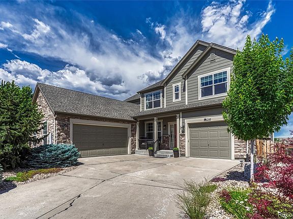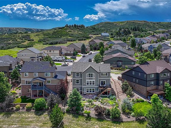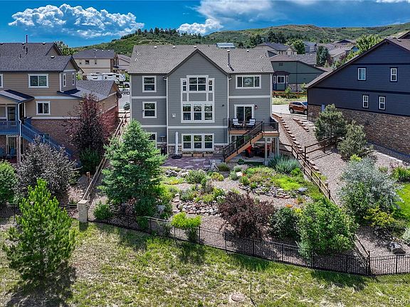 Panoramic mountain views of the front range and Castle Rock. Quiet location at the end of a cul de sac. This home glows with pride of ownership, beautiful upgrades, and its' pristine condition. Gourmet kitchen includes a new double oven, gas cook top, stainless steel appliances, maple cabinets, walk-in pantry, slab granite countertops, kitchen island with room for stools. Main level is open with large picture windows, natural lighting, gas fireplace with a carved wood surround, office with built-in desk, recently remodeled mud room, formal dining area, real hardwood floors, upgraded hardware/lighting/plumbing fixtures, oversized 3 vehicle garage, and a new deck. Upper level has 4 bedrooms, 3 full bathrooms, walk-in closets, & all new carpet. Primary suite has a two sided gas fireplace w/floor to ceiling stone surround, vaulted ceilings, lots of windows/natural lighting/amazing views, mechanical shades. Spa like bathroom has stone floors and counter tops, deep soaking jetted tub, dual vanities and cosmetic area. Walk-in closet is a full room with custom built, adjustable shelving. Walkout basement is unfinished with a good layout to add additional living space. Outdoor living area is equally as impressive with a large red rock slate patio, steel fire pit made from old mining gear, and its' own botanical garden with a wonderful blend of different flowers and fruit plants (Raspberries, Blackberries, more). Covered patio has afternoon sunshades, LED rope lighting, & ceiling fan. Fully fenced yard with wire mesh & auto sprinkler system. Newer exterior paint, water heater, outdoor lighting fixtures, outdoor lighting, exterior security cameras. Close proximity to downtown Castle Rock, I-25, DTC, gold courses, schools, stores, hospital, trails, parks, DC Fairgrounds, The MAC, & CR Rec Center. If you have been waiting for a property with great views, lots of upgrades, in top condition, on a quiet street, THIS IS IT !
