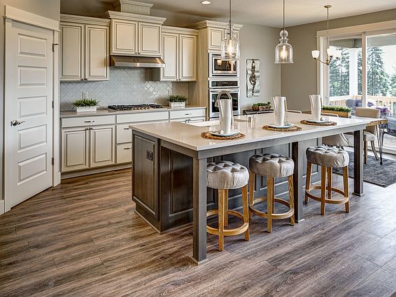 The St. Helens home design is a spacious layout that flows easily while also providing the extra privacy that homeowners appreciate when it comes to bedrooms. This home is set up so that activity in the heart of the home isn't likely to disturb those in their bedrooms. As for the bedrooms, this layout is also flexible, with three to four bedrooms available, depending on how you choose to use the space. There are also options for two, 2.5, or even three bathrooms, and the choice of a two- or three-car garage. On top of it all, you get 2596 square feet of living space to savor.Starting with the multiple elevations that give the St. Helens a traditional or modern appearance, you're already getting great curb appeal with this home, including the welcoming front porch. There are also side and transom windows around the front door that are both beautiful and great for adding natural light into the large entry. Inside, the entry has a convenient coat closet and continues into a coffered-ceiling hallway. Also just off the entry is the den with an arched entrance or optional double doors. The den's placement makes it ideal as a home office.
