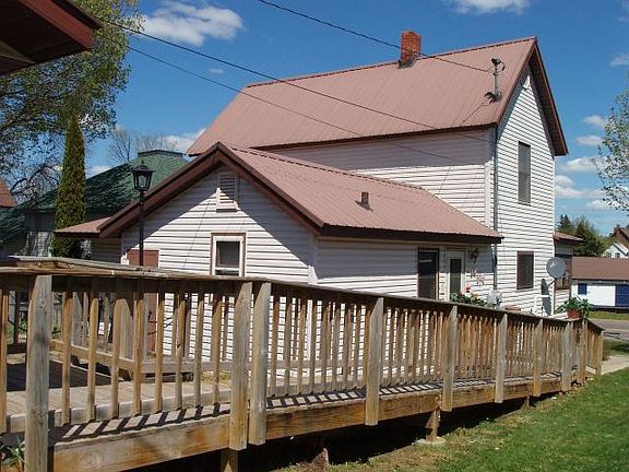 (351/DW) Conveniently located on Highway 13 in Park Falls is this 3 bedroom, 1 bath, vinyl-sided home offering many fine features. The home is handicap accessible with a ramp from garage to house. The home features a kitchen, dining area with patio door leading to enclosed concrete patio area. There is a convenient 1st floor laundry offering plenty of storage. The living room has a bay window, a vaulted ceiling and electric fireplace and has an adjacent sitting area. A carpeted bedroom and enclosed sun porch complete the first level. The upper level has 2 bedrooms with walk-in closets. There is a partial stone basement with a newer Trane furnace and central air, a 40 gal. NG hot water heater and 100 amp circuit breakers. The exterior of the home and garage have vinyl siding and metal roofs. Well worth a serious look. See it today. $59,900. 2020 taxes: $1,251. (23-40N-1W)