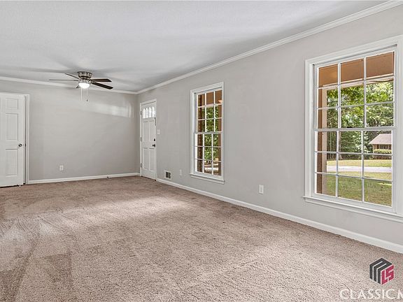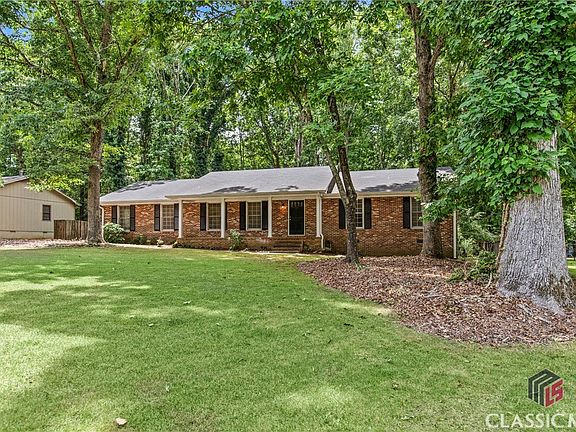 Welcome to this charming brick ranch home, featuring 4 spacious bedrooms and 2 updated bathrooms. This move-in ready gem boasts two inviting living room areas. One living room is highlighted by a cozy brick fireplace and offers easy access to the screened-in porch, perfect for enjoying serene mornings or relaxed evenings. The eat-in kitchen is equipped with stainless steel appliances and a convenient wet bar area, ideal for entertaining. The home also includes a bright dining area/sunroom with elegant French doors. Three bedrooms occupy one side of the house. The fourth bedroom is designed with built-in shelving and occupies the other side of the home making it perfect for a home office. The updated bathrooms enhance the home's modern comfort and style. Natural light floods the home, creating a warm and welcoming atmosphere throughout. This home sits on a private and level lot adorned with mature trees and a fenced in yard. A detached garage, which can be used to park your cars or for extra storage and a workshop. This home is close to Loop 10 access, restaurants and shopping. Schedule your showing today!