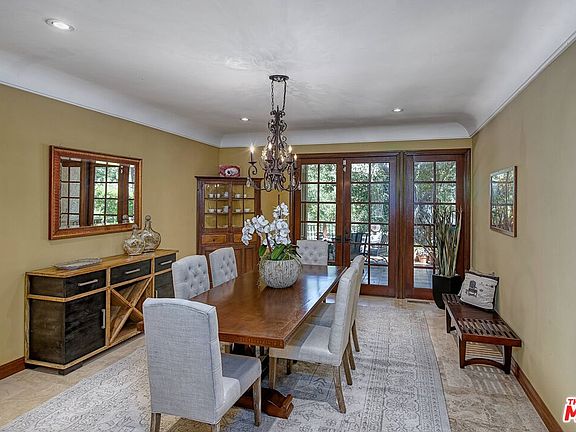 Welcome to this Spanish oasis in the heart of Bell Canyon. This alluring home is tucked among old oak tree canopies and offers privacy, elegance and numerous entertaining options. A large formal entry greets you with double iron doors and stone flooring. On that level there is a lovely en-suite bedroom, 2 powder rooms and a spacious laundry room with storage. The entry opens into the living spaces which include a full bar, complete with sitting area and wine cellar. The beautiful living room with fireplace and beamed ceilings flows through French doors out to a large deck overlooking the spectacular yard. The adjacent formal dining room looks out over the yard and transitions to the large gourmet kitchen with center island, breakfast bar, high-end, Viking appliances and plentiful cabinetry. The family room with fireplace and beamed ceilings features another deck through French doors to the yard and an additional spot to relax and enjoy the view. Upstairs there are three very spacious bedrooms all with remodeled en-suite baths as well as a storage closet. The primary suite is its own escape featuring high beamed ceilings, a fireplace, large sitting room area and a balcony tucked into the oaks with views of the gorgeous landscape and sparkling pool. The primary bath has a double limestone vanity, stone shower, and spa tub with a large custom closet. Outside, just beyond the two decks is a gorgeous pool situated perfectly among the natural ambiance of Bell Canyon. With plenty of hardscape around the pool for alfresco dining, lounging, and relaxing this home covers all the bases and does it in style. Bell Canyon is guard gated and offers an equestrian center, tennis courts (pickleball coming soon), community center, gym, trails, events and award-winning schools.