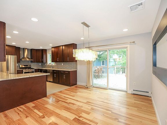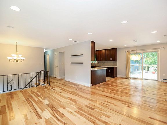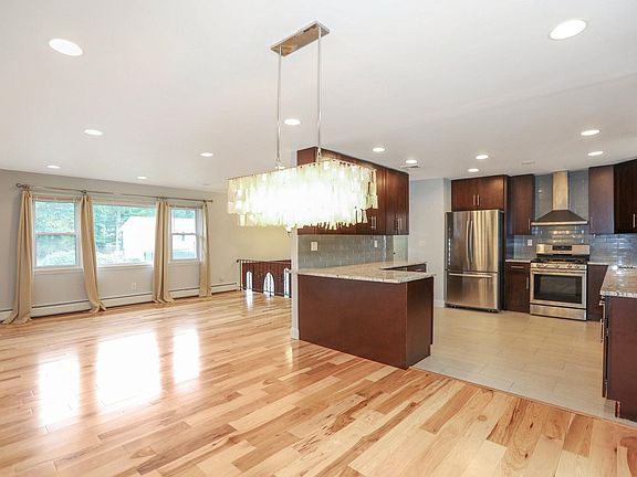 Beautiful 4BR, 2 BA updated sugar maple split on private street in quiet community. Upper level features bright open layout with LR, DR with sliding glass door leading to deck with outdoor table, chairs and umbrella, updated kitchen with cherry wood cabinets, granite countertops, SS appliances and six burner cooktop, MBR with BA and 2 additional BRs and updated full BA. Hard wood floors throughout, central air, baseboard gas heat. Lower level has laminate floors, den with fireplace, 1BR and full BA, laundry room with washer & dryer, sink and second SS refrigerator/freezer. Large driveway, 1car garage converted to a storage room.