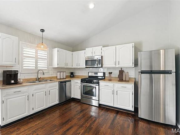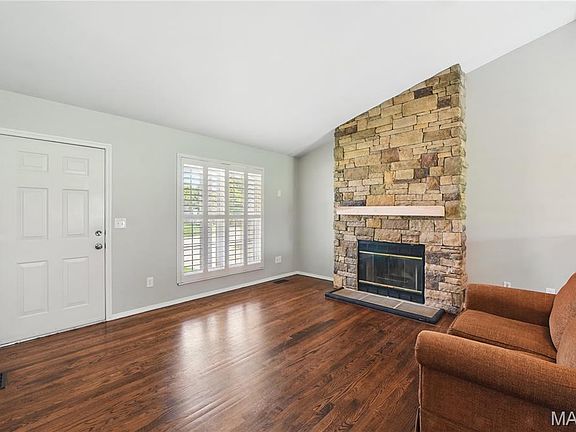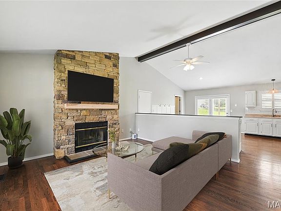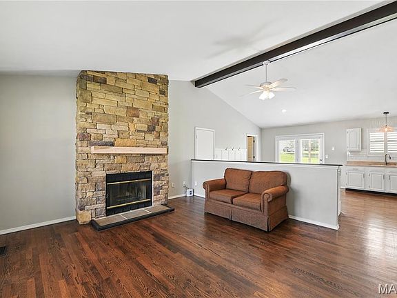 This thoughtfully updated ranch offers a welcoming blend of warmth and style. Step inside to an open floor plan with vaulted ceilings and a striking stone fireplace that anchors the main living space. The kitchen makes a statement with white cabinetry, subway tiles, stainless steel appliances, gas cooktop, pantry, and generous prep space. From the kitchen, walk right out to the patio and enjoy the large backyard—perfect for relaxing, entertaining, or play. The main level features two comfortable bedrooms, a main floor laundry room, hall bath, and a nice sized primary suite with a walk-in closet and private bathroom. The finish in the lower level expands your options with flexible space for a home office, gym, or hangout zone. Ideally located just minutes from Highway 364, shopping, and dining—this move-in ready home delivers both convenience and charm.