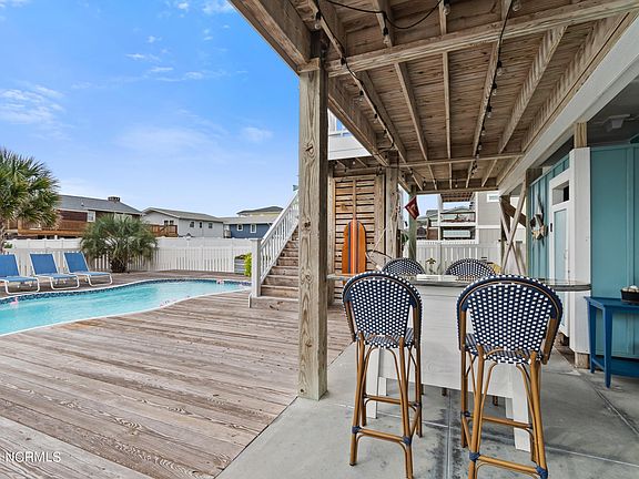 WELCOME HOME TO YOUR OWN HOLDEN BEACH OASIS! This one owner inverted floor plan home is the ultimate getaway with private pool to soak up the HB sunshine, gorgeous outdoor living space, & an interior to match accentuated by incredible ocean views! Coastal living at its best in this stunning 4 bedroom, 3 ½ baths located on a corner lot & within steps you will be dipping your toes into the glistening waters along the shoreline of Holden Beach & gathering seashells. WOW is an understatement of the upper level views of the ocean whether sitting on the rear covered porch, enjoying a meal or doing the kitchen dishes. Upper level kitchen offers lots of white cabinets, granite countertop, large pantry, kitchen sink offers reverse osmosis water, plus all appliances remain. Open living & dining area features a trey ceiling accented with bead board & spacious enough to entertain a crowd. Lots of custom trim work throughout the home. The upper owner's suite is a dream retreat, with views of the ICW & a bathroom with double vanity & oversized tile shower. The main level boast a second sitting area with access to a covered deck, laundry room with lots of cabinetry, sink, & stack washer/dryer. The split bedroom floor plan on the main level offers one bedroom with its own private spa-like bathroom that includes a oversized tub, & two other spacious bedrooms that are joined by a shared bathroom. Need help with groceries or luggage, no worries this home offers an exterior lift! The home offers spray foam insulation + upper & lower water heaters for continuous flow. The back yard is an oasis that includes an in ground pool with a sunning shelf or on a cool even turn on the pool heater & relax with a coastal beverage & enjoy being surrounded by the tropical landscaping. Sold Furnished with list of items that will NOT convey. Great location to bike or golf cart ride to local restaurants, shopping, the HB Chapel, or summer concerts under the bridge.