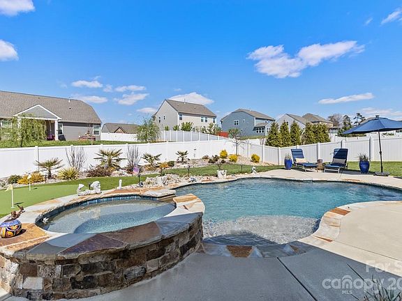 Back on the market at no fault of the seller. This immaculately kept home is so spacious and has much to offer. The main floor boasts a split floorplan with both the primary, a second bedroom, two full baths as well as half bath for guests. The open living room/kitchen combination has a huge island with plenty of storage, a breakfast nook with practically new appliances. To round out the main floor, you have a butler’s pantry/coffee bar, dining room, laundry and drop zone. Upstairs you will find two more bedrooms, a full bath and another living area. But outside is where the action is. Step out under a covered patio to a beautiful gunite, saltwater, heated pool with a built-in hot tub feature. Enjoy the waterfall from the hot tub and fountains from the side. If that isn't enough, you have a professional putting green to help perfect that golf game and an outdoor kitchen area. Enjoy this outside oasis with your family and friends. And don't miss the three car garage w/lots of storage.